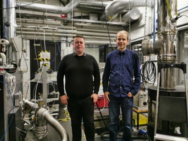 Pasi Jalava (left) and Olli Sippula in the ILMARI laboratory space, featuring several combustion devices.