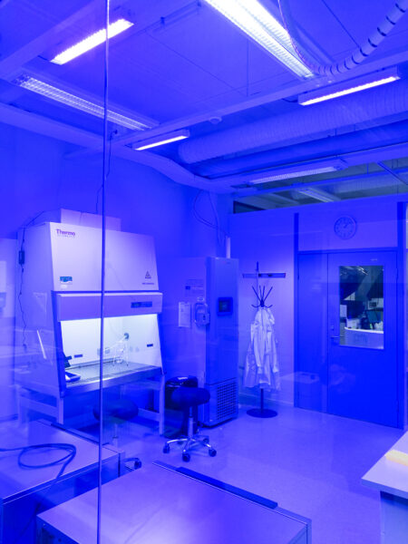 Yrityksen sinivaloteknologia käytössä laboratoriotilassa.