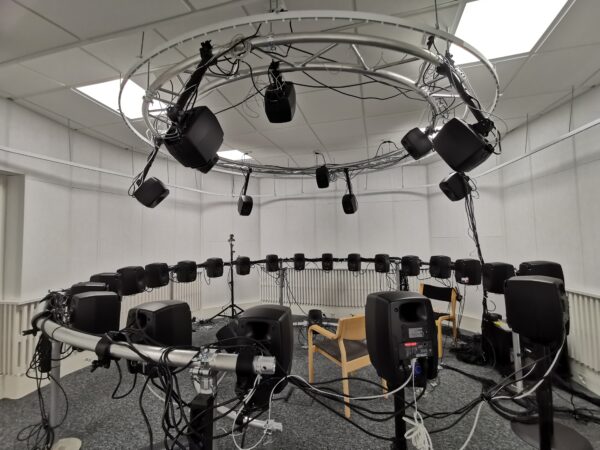 Kuulolaakson kuuntelutila, joka on varustettu ympyrään asetetuilla kaiuttimilla.